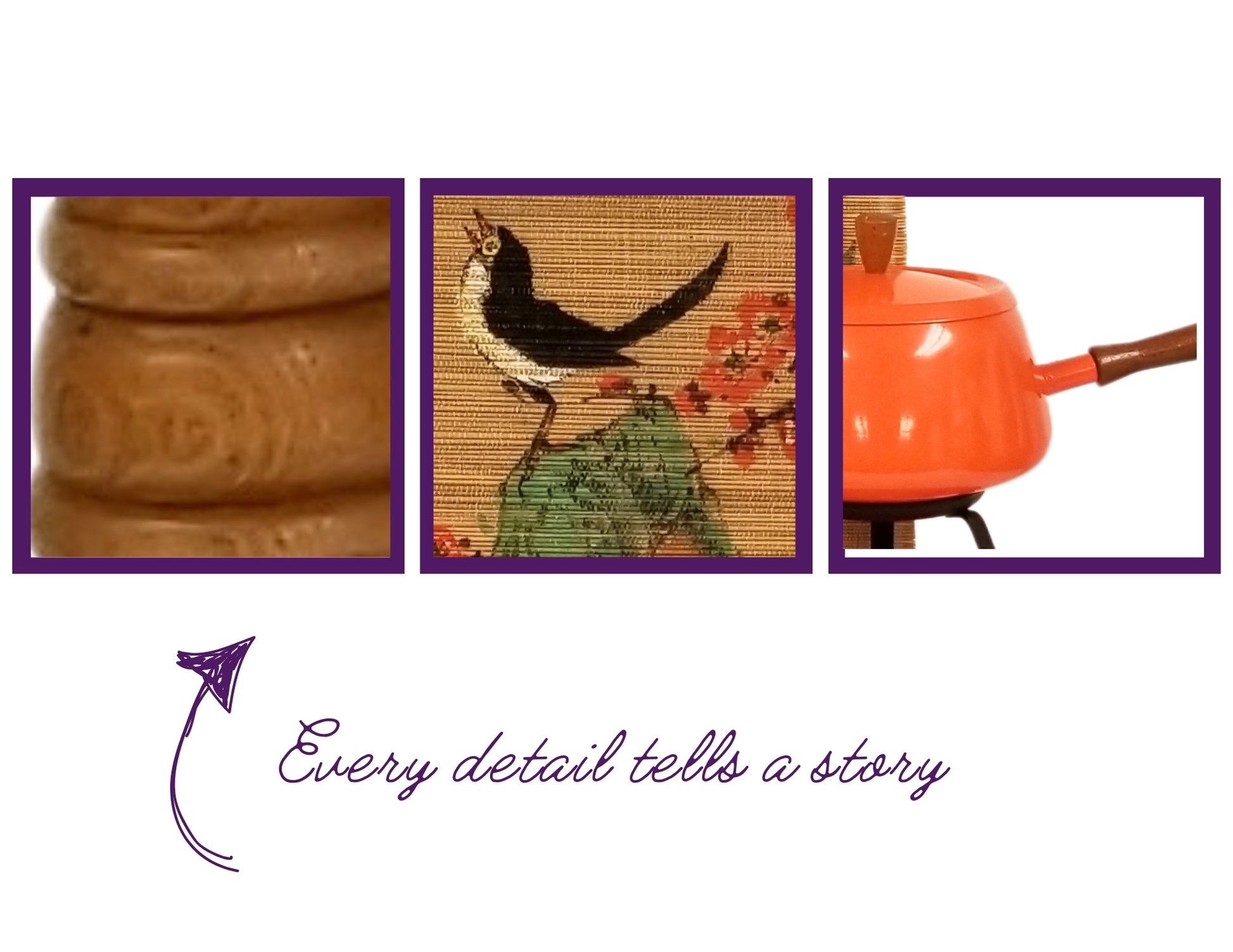 The hand painted bamboo screen was acquired for another gift, but once I found a fondue pot that matched the cheery deep orange blossoms, it was reassigned. After some serious scouring of vendors, an amazing vintage fork set in a cool little holder manifested in the same honey color as the painted bamboo screen. It was meant to be!