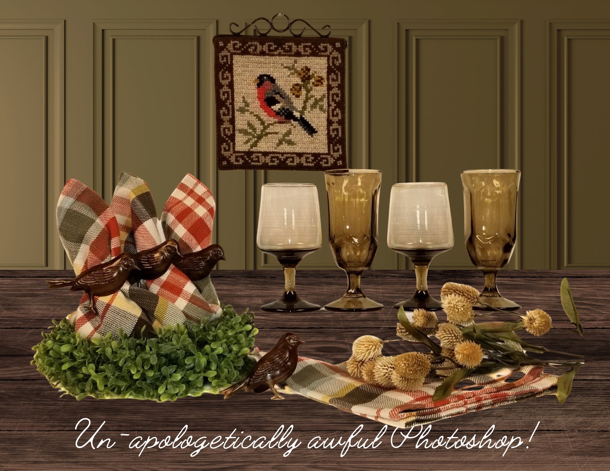 Come to find out the Bullfinich is known to store food in its cheeks and use it to feed others. What a nice gesture for a thoughtful gift! The Swedish style needlepoint is exquisite, it seems to be stitched with wool yarn and is mounted on a black scroll design hanger. The colors are rose, vermilion, deep brown, tan, gold, olive and blue gray. It is from the 70's and in excellent condition. The 70's vintage vibe includes 4 mix and match glasses from Libby in a subtle smoky brown color. I found the perfect plaid napkins in tones that magically match the needlepoint in a thrift shop, with the tags still intact. (They have since been washed and pressed). The adorable bronze color metal napkin rings from an online resale marketplace, tie up this gift vignette in a perfect package. The faux wreath and florals are display only and not included in this gift.
