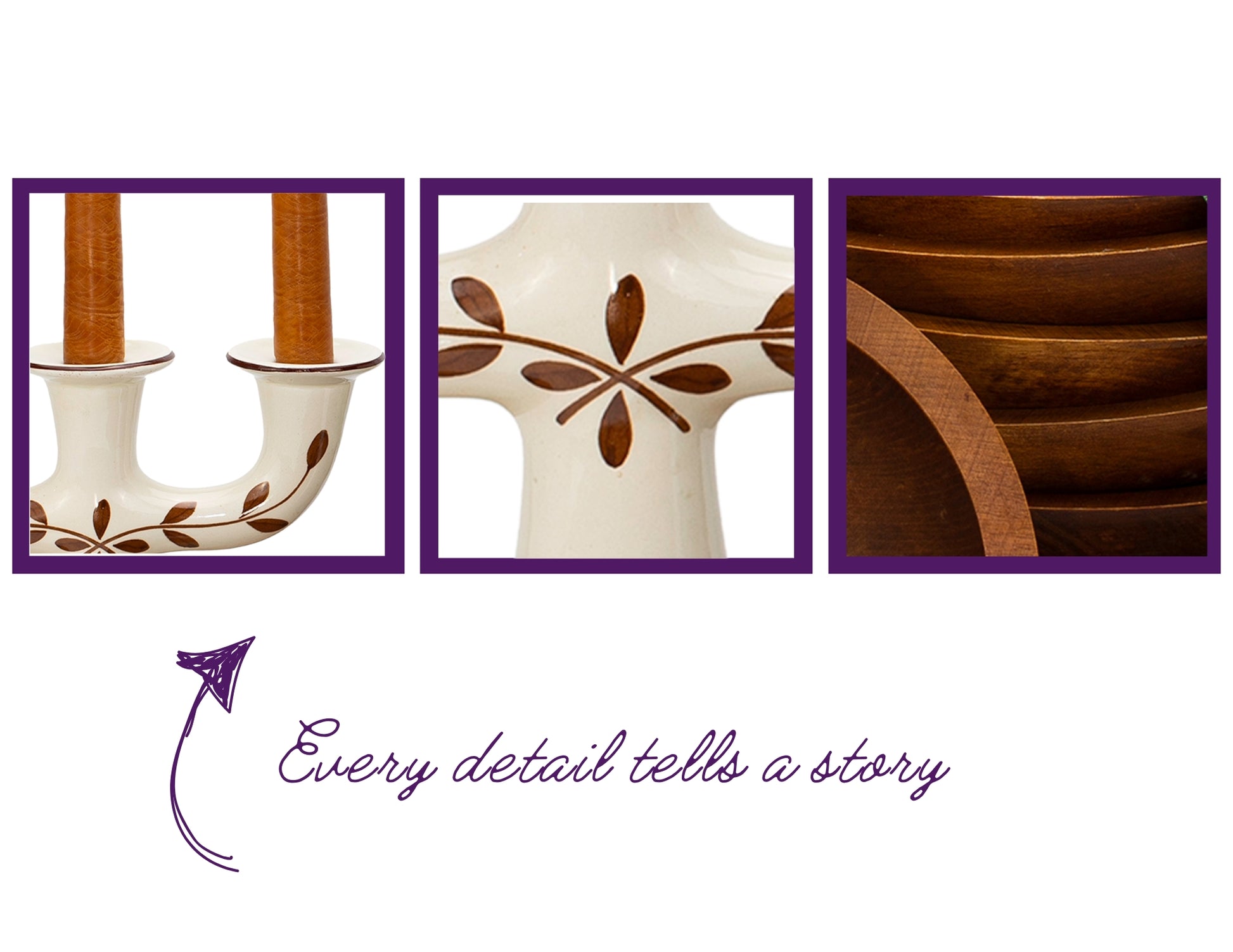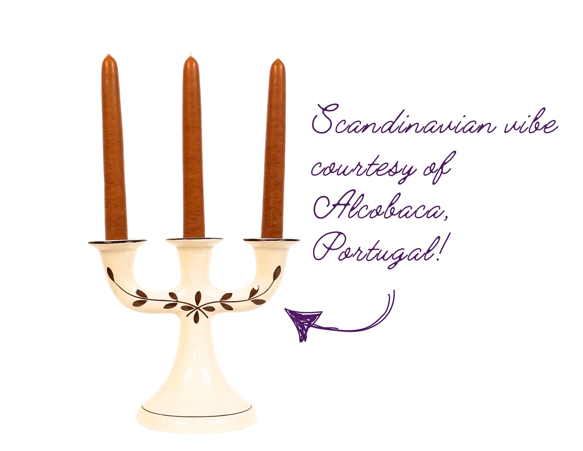 I found an article about Portugese Interior Design after picking up this beautiful vintage candelabra, thinking it might be Scandinavian. It is actually made in Alcobaca, Portugal. Apparently light colors and natural wood tones are distinctive to the harmonious and warm atmosphere of Portuguese style. Bingo! This inspired me to partner the, creamy white candle holder with the natural handmade Canadian made birch bowls. They complement each other perfectly. The pumpkin color candles give a subtle pop of color without a harsh contrast, keeping the vibe calm and cozy.