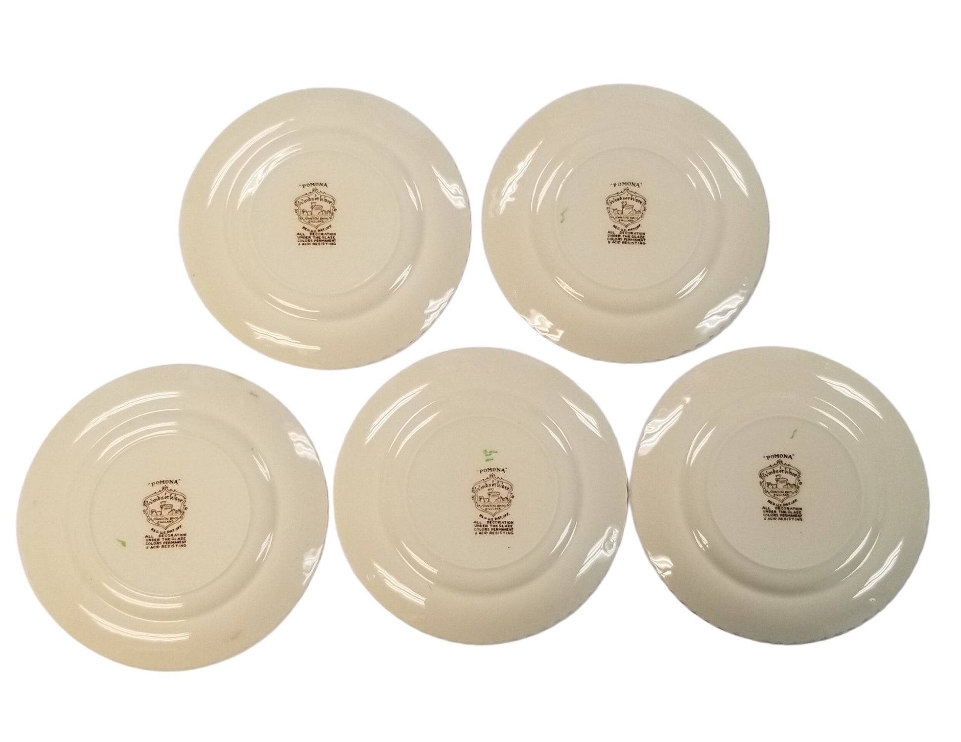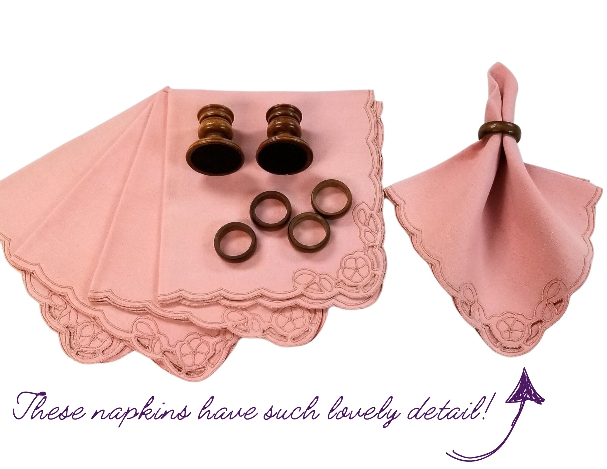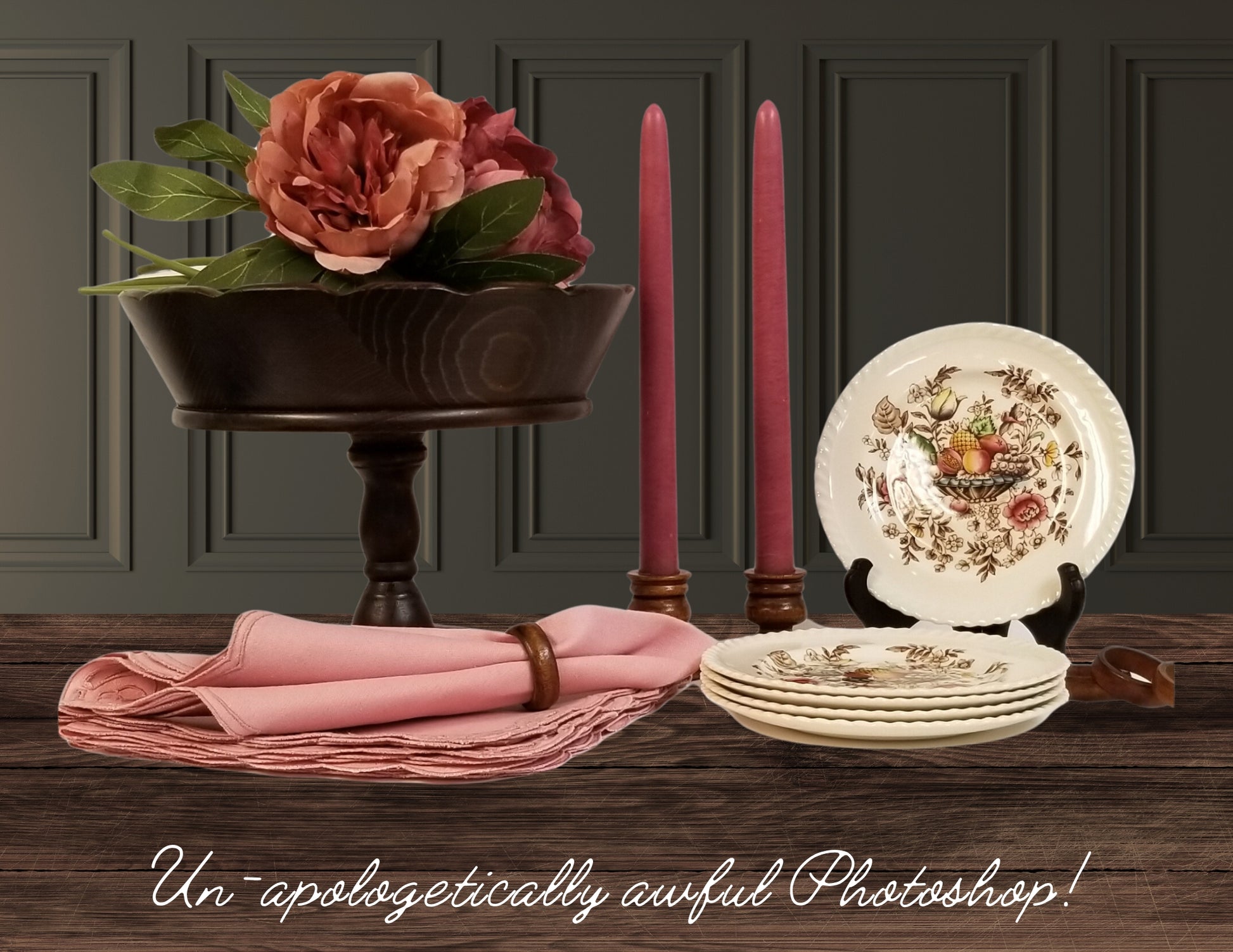 A set of 5 vintage Johnson Brothers bread plates in the “Pomona” pattern feature a pattern of fruit and flowers in rich shades of chocolate, mauve, green and blue. I love the combo of brown and mauve together, so the scalloped edged napkins were a great find! The gorgeous dark chocolate-y stained wood pedestal bowl was the piece that inspired the whole vignette. It’s scalloped rim adds a bit of whimsy and repeats the edges of the dusty mauve napkins. Snacks, flowers, ribboned rolled napkins will all look extra special displayed inside. The dainty wood candle holders and napkin rings are an extra special touch. To round out this gift, I added a set of brand new, unscented mauve taper candles from Mole Hollow, a local candle company in my area. I would love to see this set used for a little gathering for dessert or hors d'oeuvres by candle light. The plate easel and faux flowers are for display only and not included.