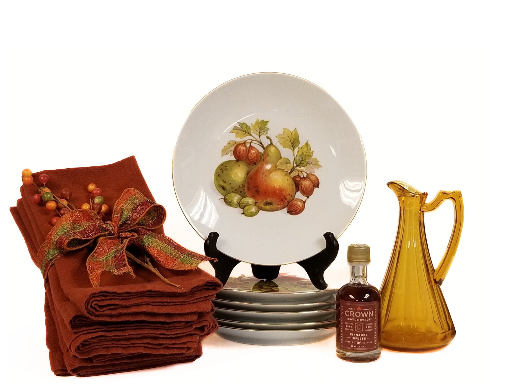 The six gently used cinnamon color cloth napkins are from my private collection. The amber cruet is of unknown vintage and was purchased from an online resale marketplace. It has a rough edge inside the spout which I filed with glass file to smooth it out. I couldn’t help myself by adding the little bottle of Crown Maple cinnamon infused syrup, made in Hudson Valley, NY and purchased from a local gourmet shop! The color palette does evoke Autumn, but the shades of the fruit and napkins are warm, earthy and gorgeous for all seasons!