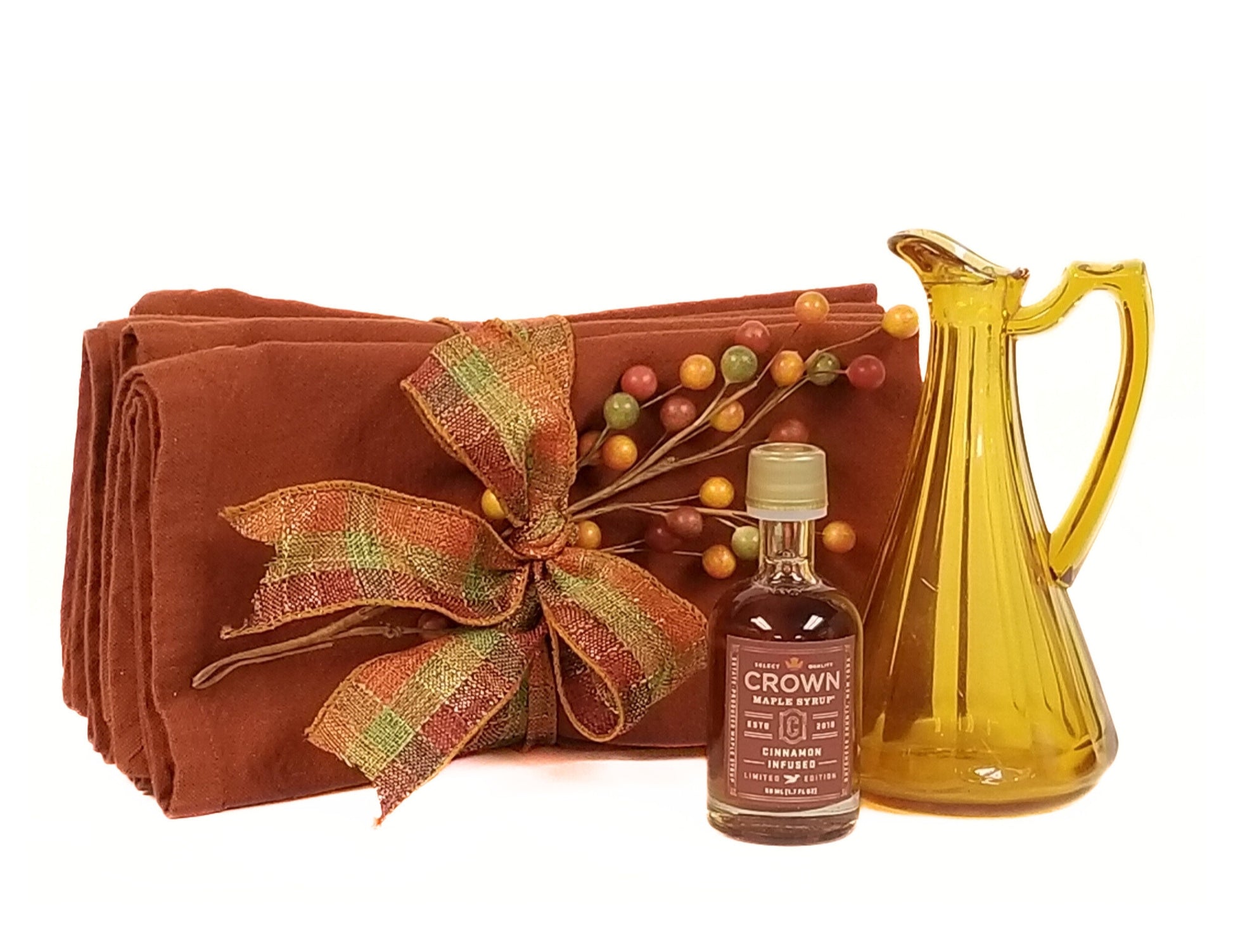 Ramp up the WOW-FACTOR: I envisioned this vignette for a cozy holiday breakfast with french toast or homemade waffles, which is why I included a little bottle of maple syrup to be warmed and served in the amber cruet. For a drool-worthy dessert, a pecan pie and vanilla bean ice cream with a drizzle of that syrup would be very special and memorable to share with family and friends.
