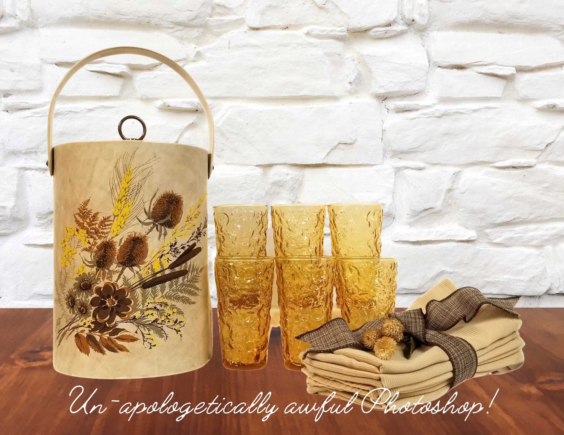 I love the earthy vibe of this golden toned vinyl ice bucket and the funky wavy textured amber glassware really brings out the texture and feel of the botanical print. The bucket is in very good condition and appears rarely used. It screams 70's to me and feels like warm and fuzzy family get-togethers from a bygone era. The groovy ribbed cloth napkins are the perfect shade of maize. This past-perfect vignette would be a wonderful house warming or engagement gift.