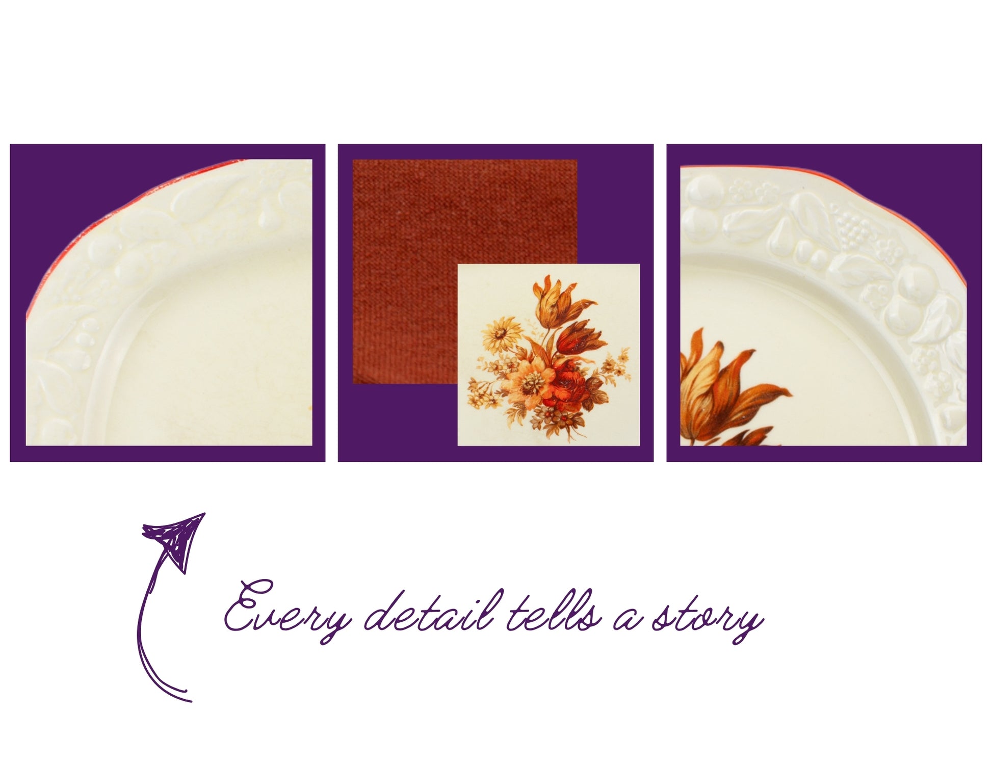 The allure of these vintage pieces was unexpected! Hidden on a bottom shelf in an antique mall and stacked among miss-matched platters, a beautiful tulip in a deep amber hue peeked out and caught my eye. Kneeling on the floor I discovered a few pieces with this beautiful meadow inspired tulip bouquet pattern on creamy ivory ground and with embossed rims. They are delicate but not fragile. There is a hint of crazing but not enough to pass them by. I am not sure I would use them to eat off of, but as a shelf display or part of a vintage wall collage, they would be perfection!
